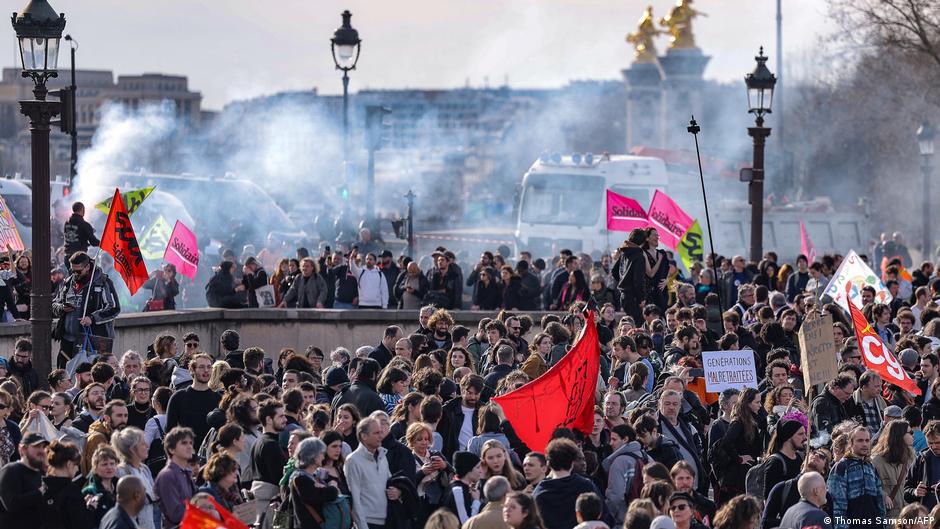 وذكرت وسائل إعلام فرنسية في وقت سابق أن اشتباكات عنيفة اندلعت بين المحتجين والشرطة في احتجاجات ضد إقرار قانون جديد لرفع سن التقاعد. واستخدمت الشرطة الغاز المسيل للدموع لتفريق المحتجين، كما تم اعتقال 61 شخصا في باريس بعد تصاعد الاحتجاجات واندلاع اشتباكات مع رجال الشرطة.