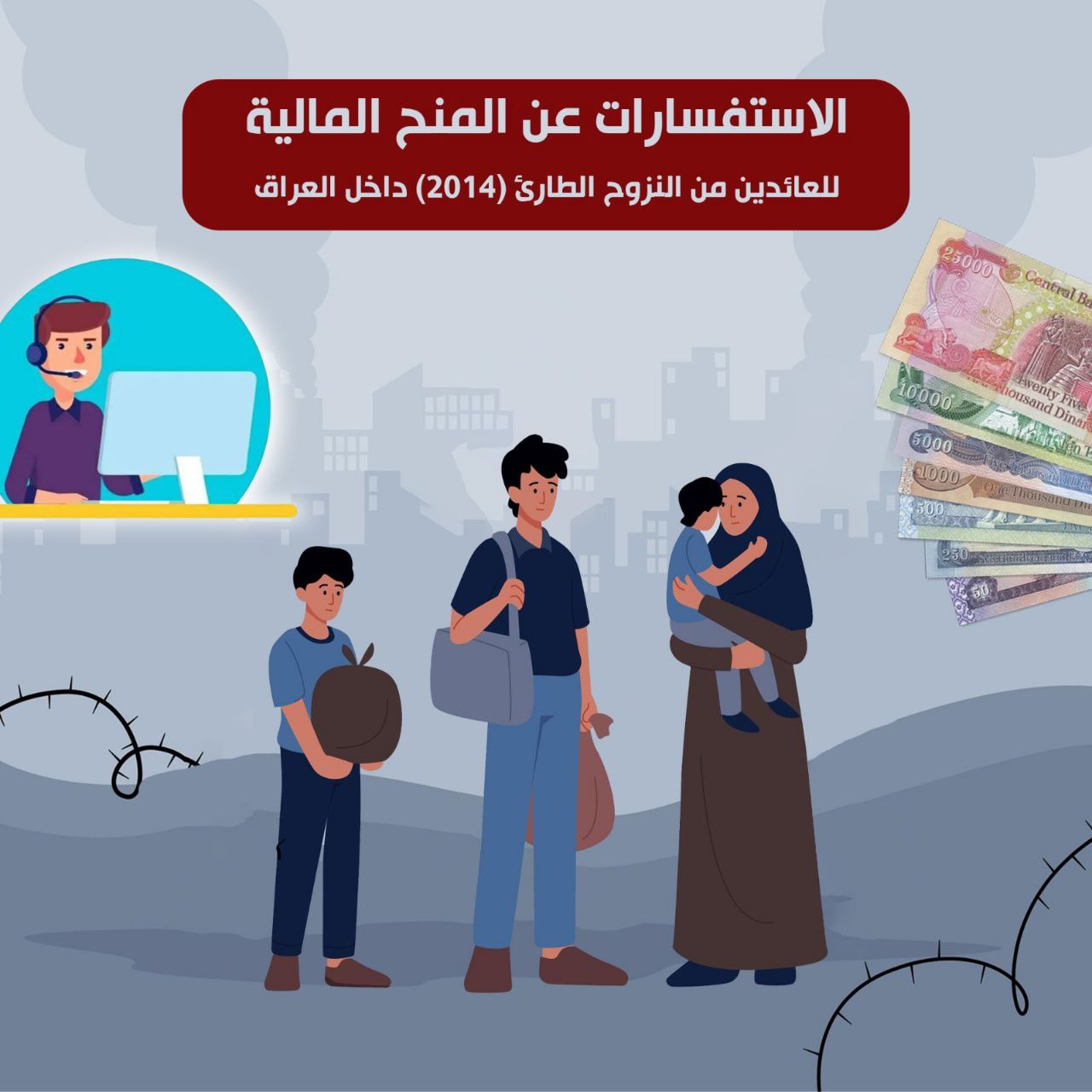 أطلقت وزارة الهجرة والمهجرين بالتعاون مع مركز البيانات الوطني خدمة الكترونية خاصة بالعائدين من النزوح الطارئ في أحداث (2014) للاستفسار عن المنح المالية الخاصة بالعائدين والمندمجين.