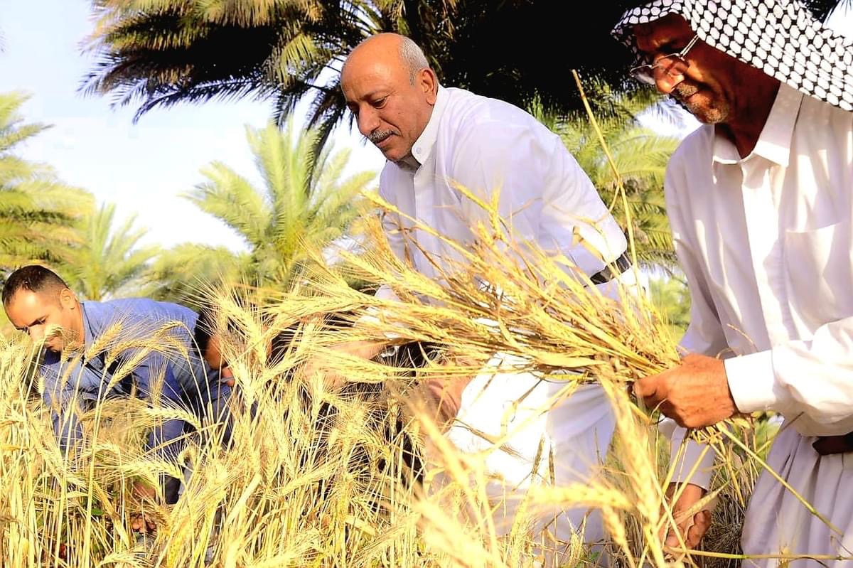 بالمنجل.. محافظ كربلاء نصيف جاسم الخطابي يشارك المزارعين الحصاد (صور)