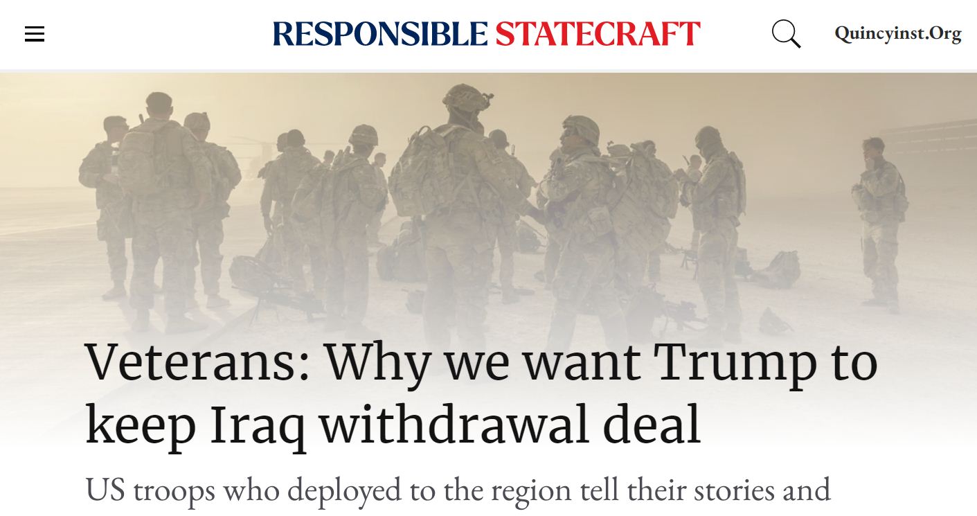 تحت هذا العنوان، نشرت صحيفة ريسبونسبل ستيت كرافت الأمريكية (responsible state craft)، اليوم الأربعاء، تقريراً نقلتْ فيه قصصاً عن القوات الأمريكية المنتشرة في المنطقة، ومنها العراق، والذين أكدوا على ضرورة إنهاء هذا الفصل، ودعوا الرئيس الأمريكي المنتخب دونالد ترامب إلى المحافظة على اتفاق الانسحاب من العراق.