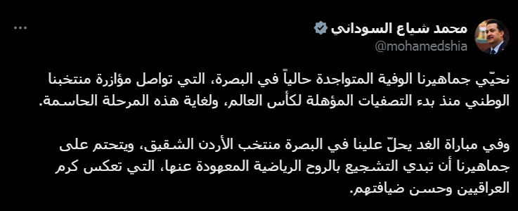 رئيسُ الوزراء العراقي محمد شياع السوداني حيّا الجماهير العراقية المتواجدة في الملعب والترحيب كذلك بالضيوف، عبر تدوينة له على منصّة (أكس)، وأكّد بأنها "وفيّة وتواصل مؤازرة منتخبنا الوطني منذ بدء التصفيات المؤهلة لكأس العالم، وصولاً لهذه المباراة التي يحلّ فيها علينا منتخب الأردن الشقيق".