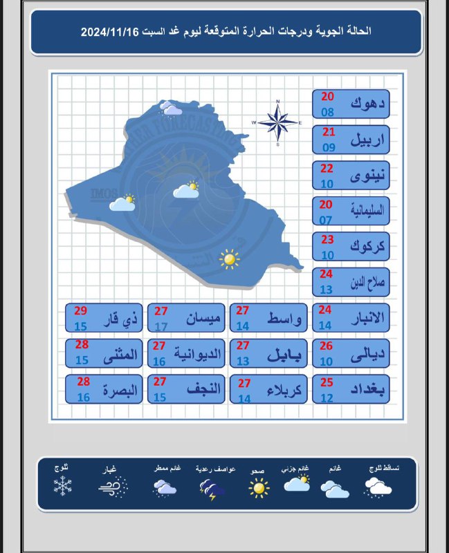 أدناه جداول حالة الطقس مع درجات الحرارة بحسب ما وردت لـ "كلمة":