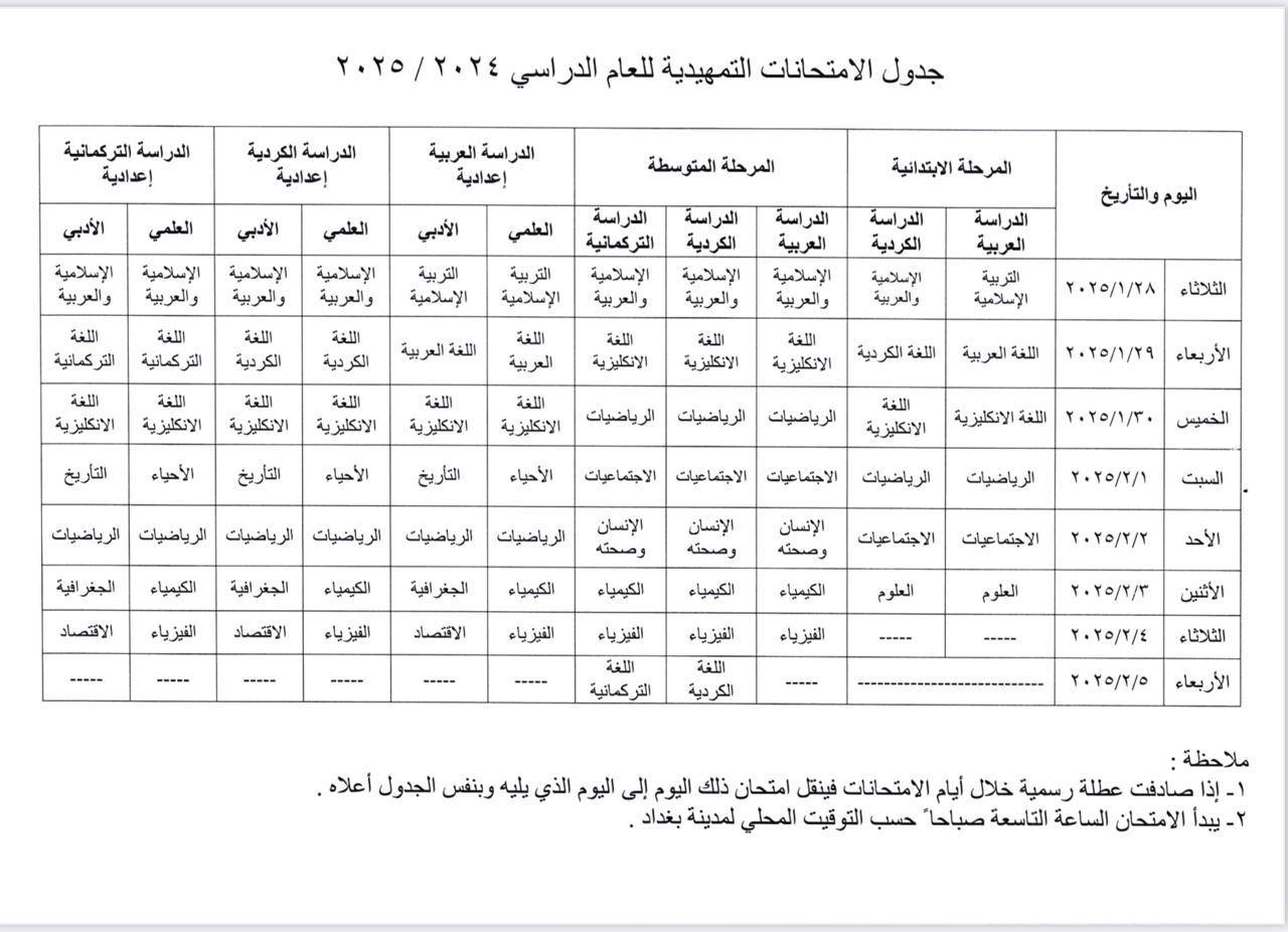 وأضاف البيان أن المراحل ستكون كتالي:-"( الابتدائية والمتوسطة والإعدادية بفرعيها العلمي والأدبي ) للدراسات العربية والكردية والتركمانية".