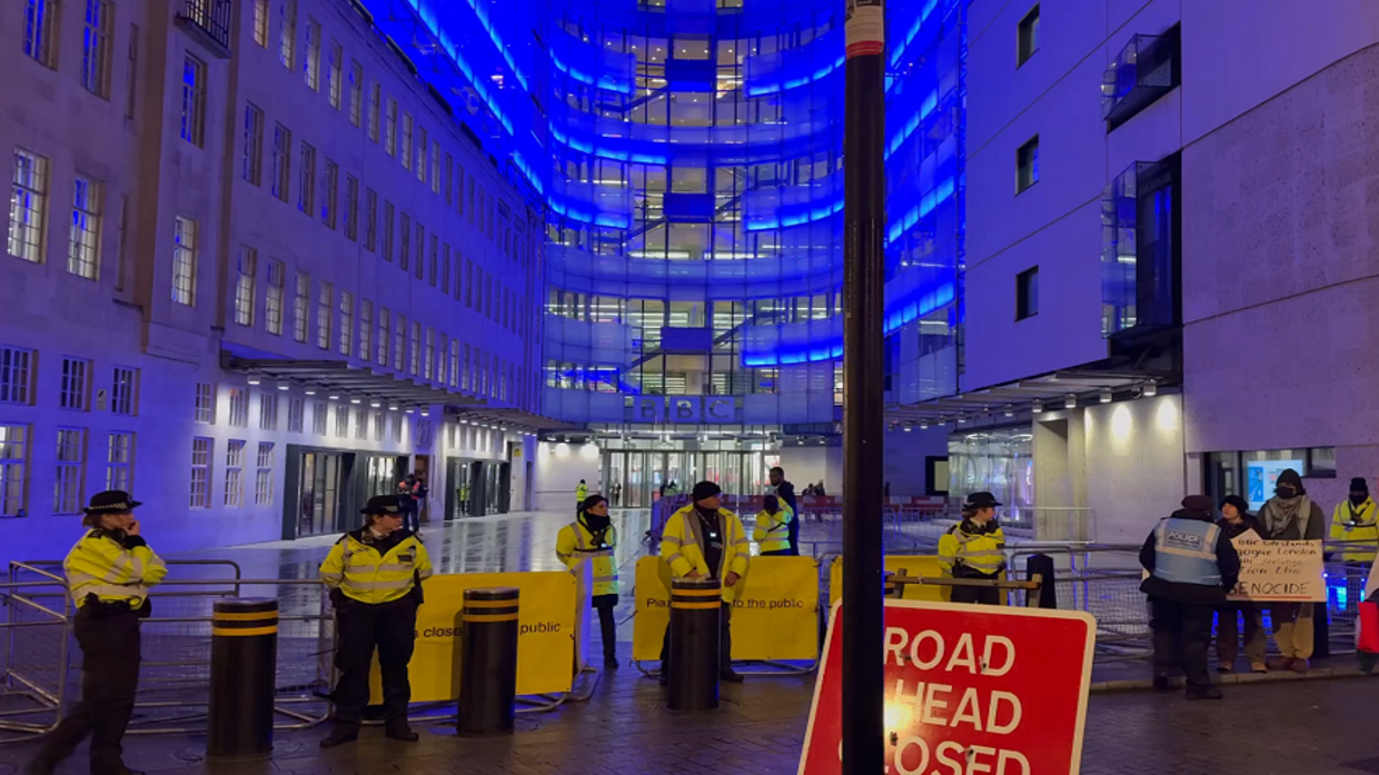 فرضت شرطة لندن مساء الثلاثاء طوقاً أمنياً حول مبنى هيئة الإذاعة البريطانية "بي بي سي"، لمنع محتجين متضامنين مع غزة من الوصول إلى مدخل المبنى.
