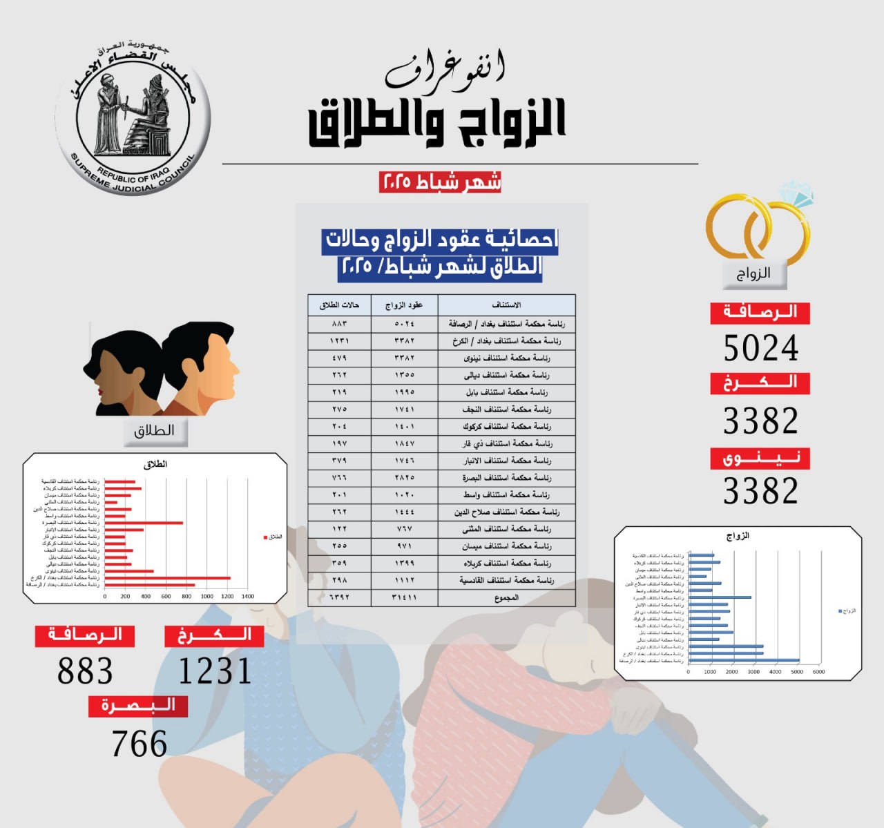 أعلن مجلس القضاء الأعلى، اليوم الأحد، بنشرة عن إحصائية لحالات الزواج والطلاق خلال شهر شباط الماضي في العراق.