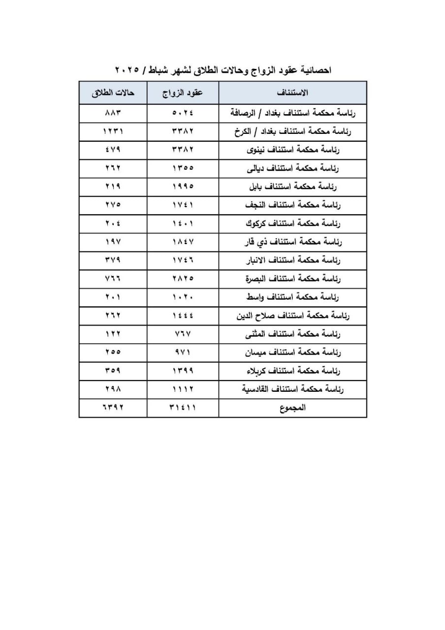 وقال المجلس من خلال النشرة التي تلقاه "كلمة الإخباري": أن "عدد عقود الزواج في شهر شباط الماضي، بلغت 31411 حالة زواج، فيما بلغ عدد حالات الطلاق 6392 حالة".