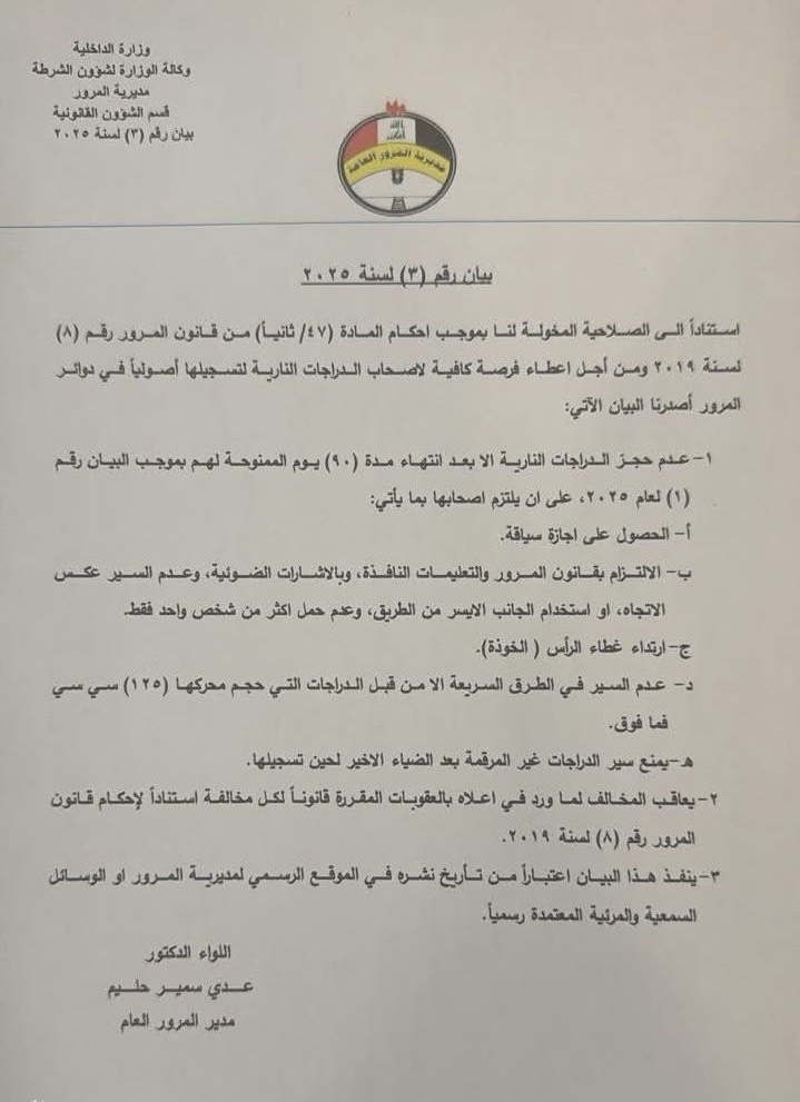 وذكر بيان للمديرية، تلقاه كلمة الإخباري، أنه "تقرر عدم حجز الدراجات النارية إلا بعد انتهاء مدة (90) يوماً الممنوحة لها لتسجيلها أصولياً بموجب البيان رقم (1) لعام 2025، على أن يلتزم أصحابها بالحصول على إجازة سياقة، والالتزام بقانون المرور والتعليمات النافذة، وبالإشارات الضوئية، وعدم السير عكس الاتجاه، أو استخدام الجانب الأيسر من الطريق، وعدم حمل أكثر من شخص واحد فقط، وارتداء غطاء الرأس (الخوذة)، وعدم السير في الطرق السريعة إلا من قبل الدراجات التي حجم محركها (125) سي سي فما فوق".