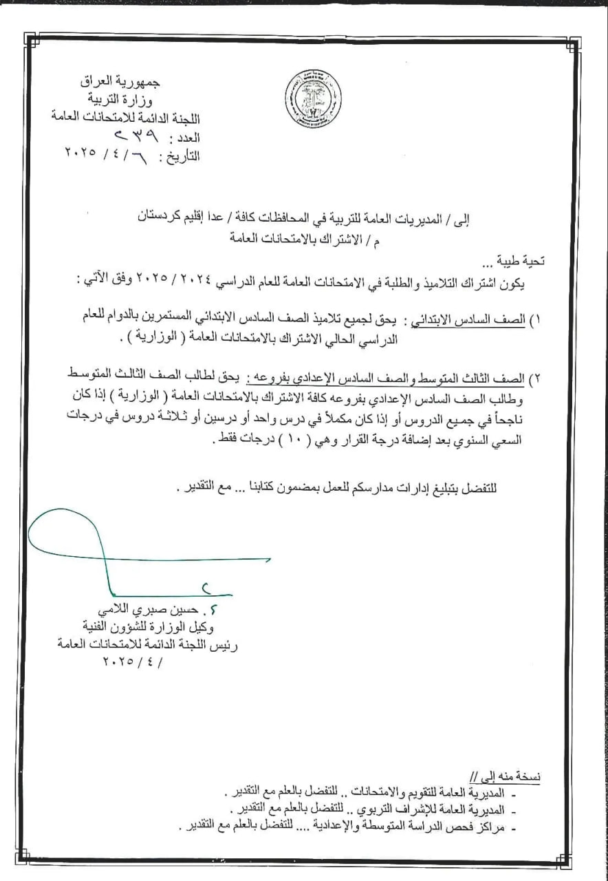 اشتراك وزارة التربية، اليوم الأحد، اشتراك خاص بطالبة السادس الاعدادي الكثير من الشعب وتلاميذ السادس الابتدائي في الامتحانات العامة.