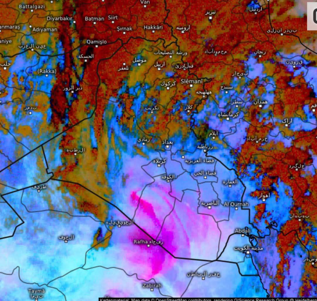 وبدأت العاصفة الترابية الدوّارة تتشكل في البادية الـجنوبية منذ عصر اليوم، في محيط منخفض جوي عميق على السطح، لتضرب المناطق الوسطى والجنوبية، حيث جاءت مصحوبة برياح هوجاء عالية السرعة.