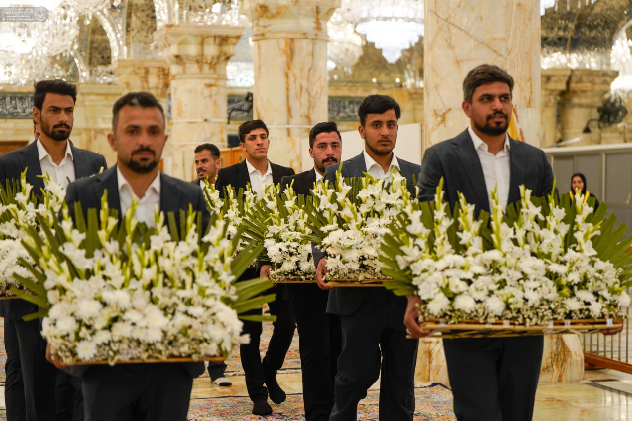 وتزيّنت أضرحة الأئمة الأطهار بالورود الطبيعية، تعبيراً عن الفرح البالغ بحلول هذه المناسبة.