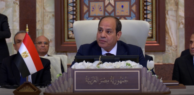 وشدد السيسي على أن "آلة الحرب الإسرائيلية تتخذ من التجويع والحرب والتدمير سلاحاً، في تحدٍ صارخ للقوانين الدولية".