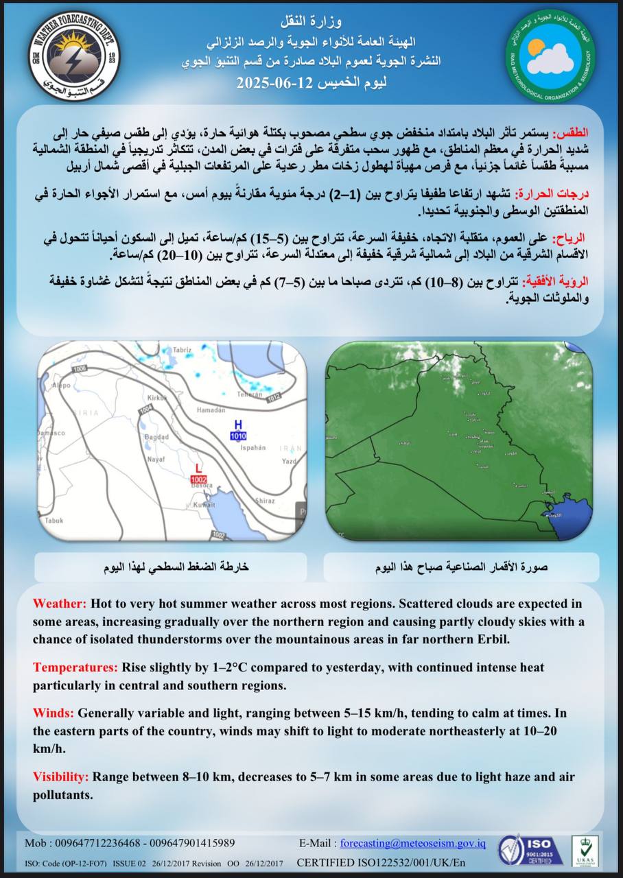 وأضافت النشرة أن "درجات الحرارة ستسجل ارتفاعاً طفيفاً بمعدل 1-2 درجة مئوية مقارنةً بيوم أمس، مع استمرار الأجواء الحارة بشدة في المناطق الوسطى والجنوبية من البلاد".