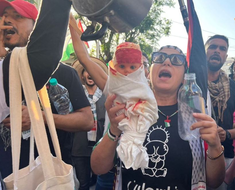 وخرج المحتجون وهم يحملون دمىً لرضّع تعلوها الدماء وقدوراً وقناني ماء فارغة، في إشارة إلى ما يحصل من تجويع وقتل للأطفال في القطاع.