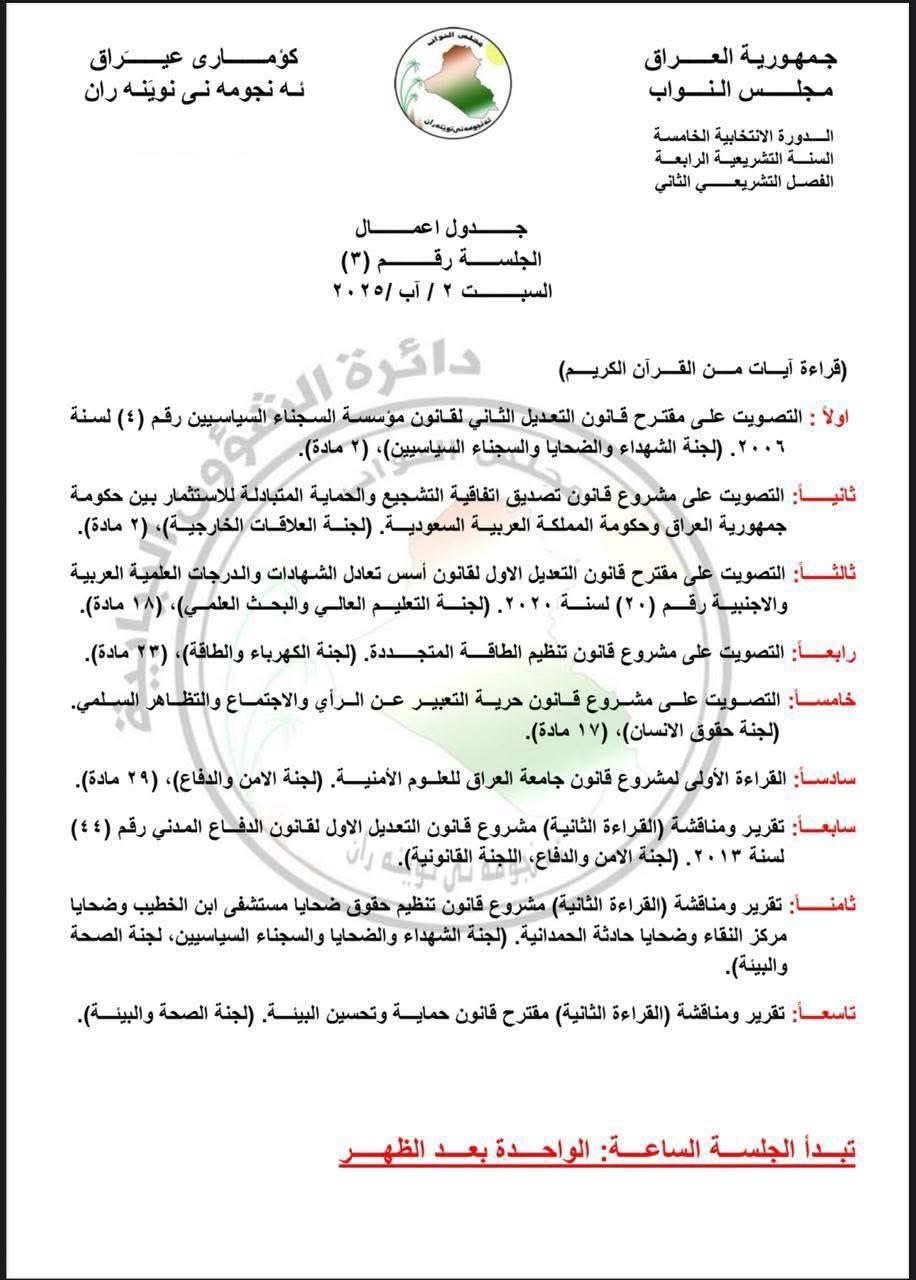 أعلن مجلس النواب اليوم الخميس عن جدول أعمال جلست يوم السبت الموافق 2 آب 2025، والتي ستكون في تمام الساعة الواحدة بعد الظهر، من الفصل التشريعي الثاني للسنة التشريعية الرابعة، ضمن دورته الانتخابية الخامسة.