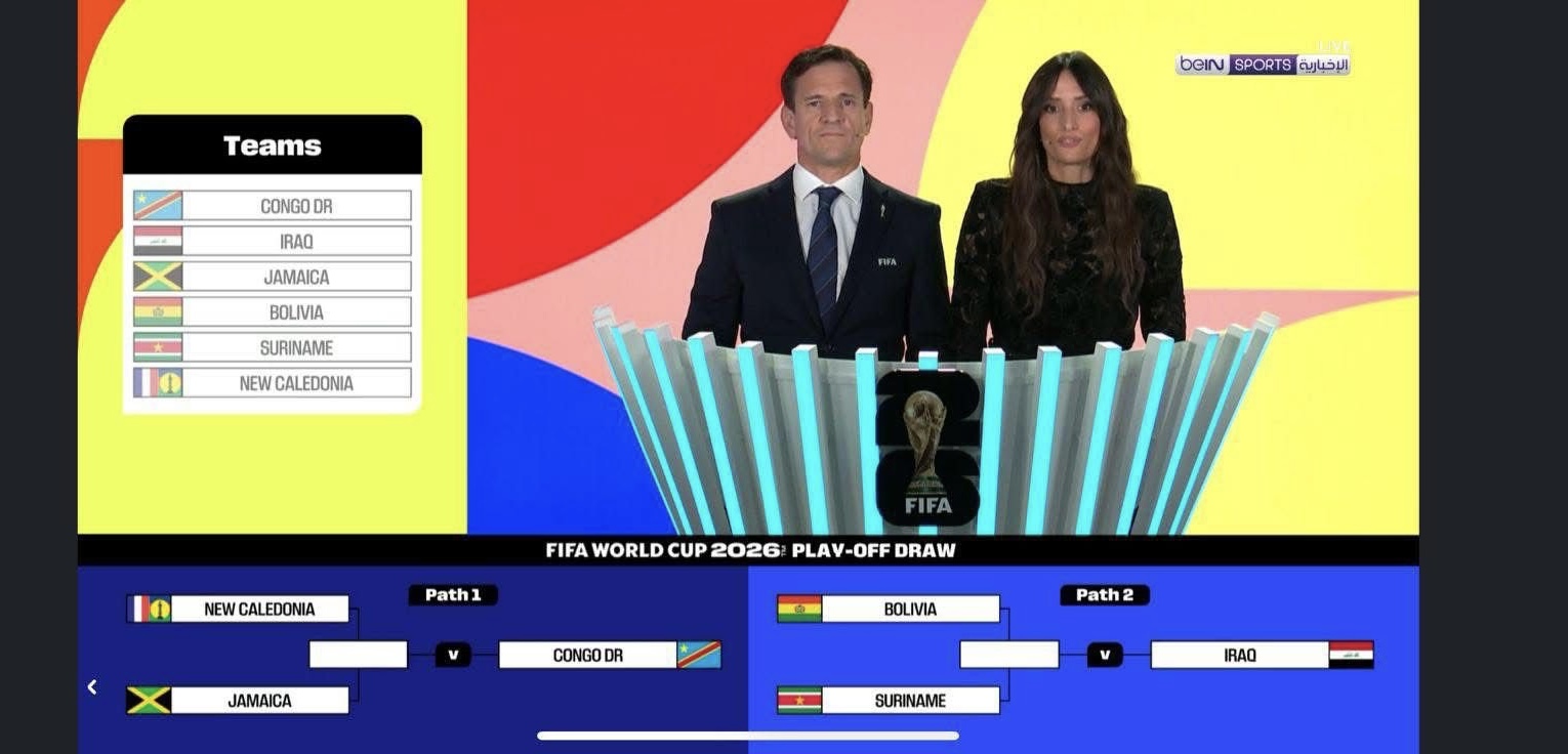 وبهذه القرعة، أصبح المنتخب العراقي في انتظار تحديد منافسه الذي سيكون إما بوليفيا أو سورينام، في مواجهة تقام خلال التوقف الدولي شهر آذار المقبل.