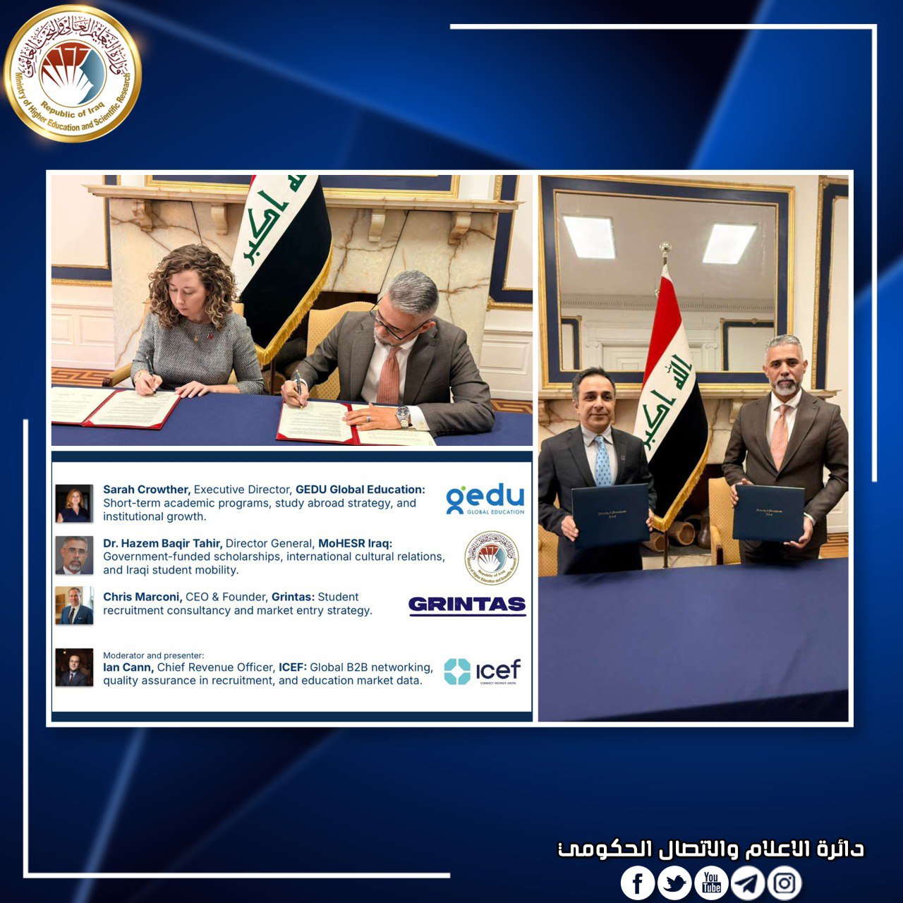 وتابعت أنه "جرى توقيع مذكرة التفاهم وخطاب النوايا في واشنطن على هامش المؤتمر السنوي لرابطة التعليم الدولي AIEA Annual Conference 2026 الذي شارك فيه العراق ممثلا بوزارة التعليم العالي والبحث العلمي إلى جانب ممثلي المؤسسات الأكاديمية العالمية".