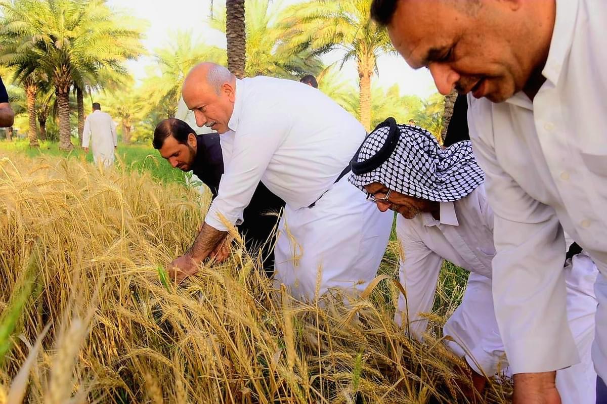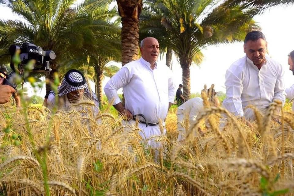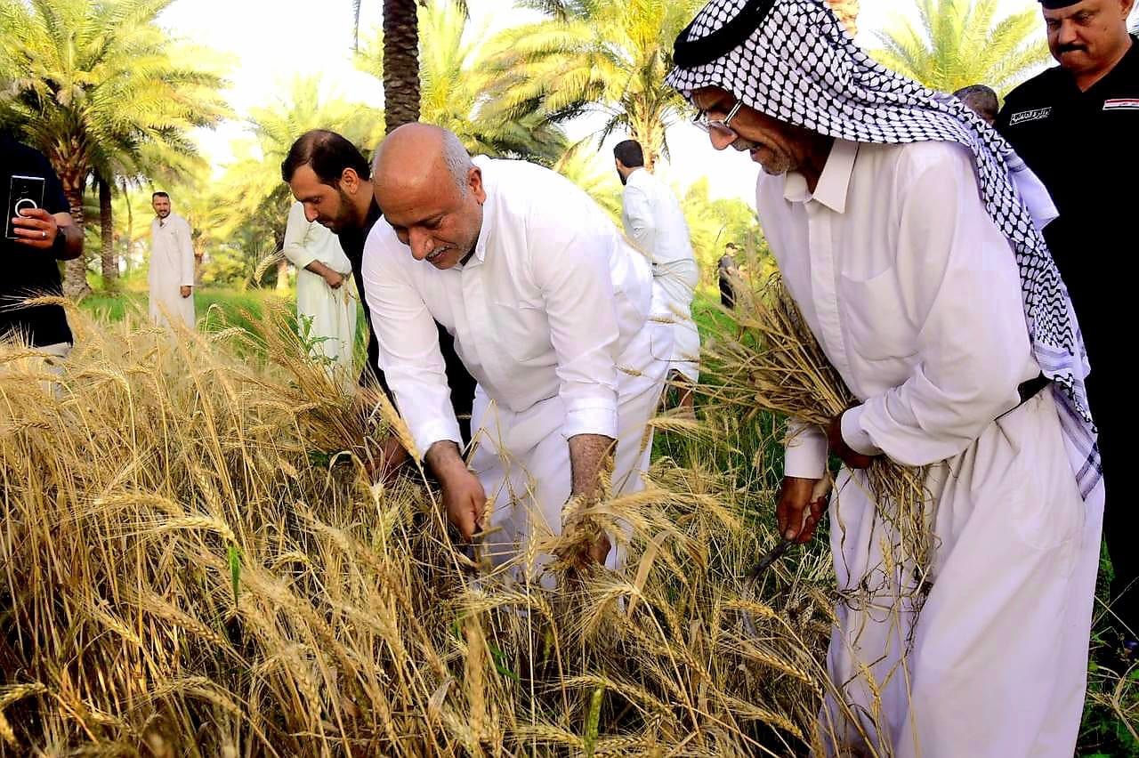 بالمنجل.. محافظ كربلاء نصيف جاسم الخطابي يشارك المزارعين الحصاد (صور)