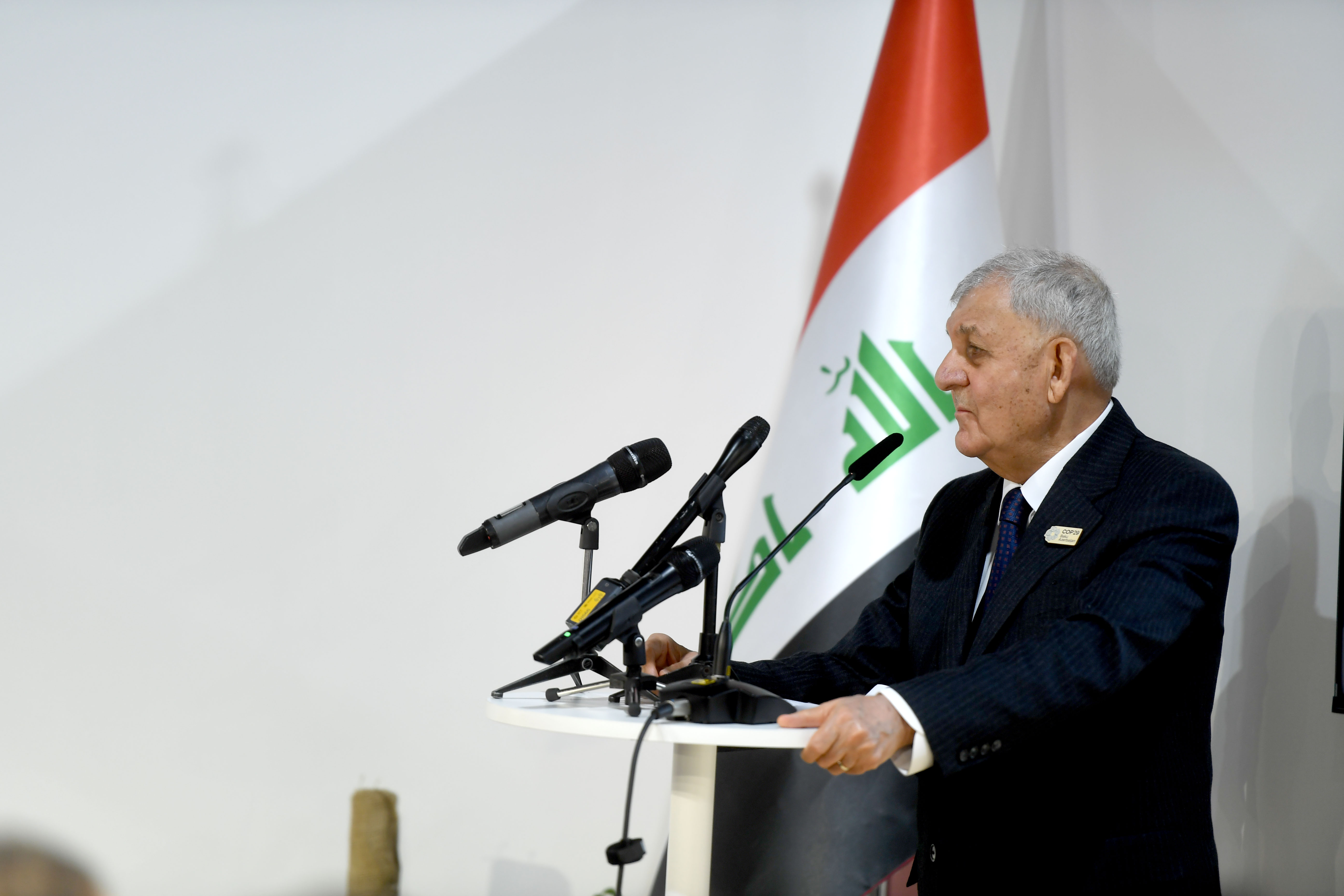 وتابع البيان، أن "رئيس الجمهورية في ختام الكلمة شكر الحضور، داعياً إياهم للتعرف عن قرب على مشاريع العراق الطموحة والنقاش حول السبل الكفيلة بإمكانية العمل والتعاون لبناء مستقبل أفضل للجميع".
