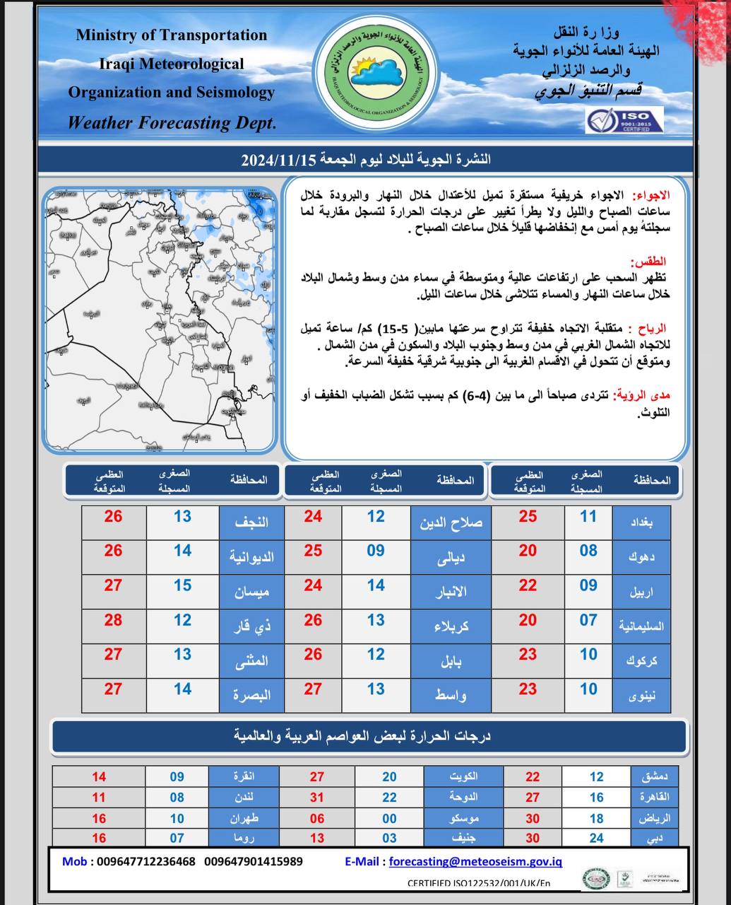 أدناه جداول حالة الطقس مع درجات الحرارة بحسب ما وردت لـ "كلمة":