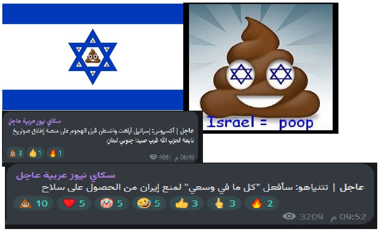 تابعَ موقع (كلمة) الإخباري، أكثر استعمالاتِ المتابعين لقنوات وسائل الإعلام على التلكرام، والتي يبرز من بينها أيقونة البراز الـ (Poop Emoji)، ولعلَّها الأشهر في الردِّ على تصريحات الحكومة الإسرائيلية.
