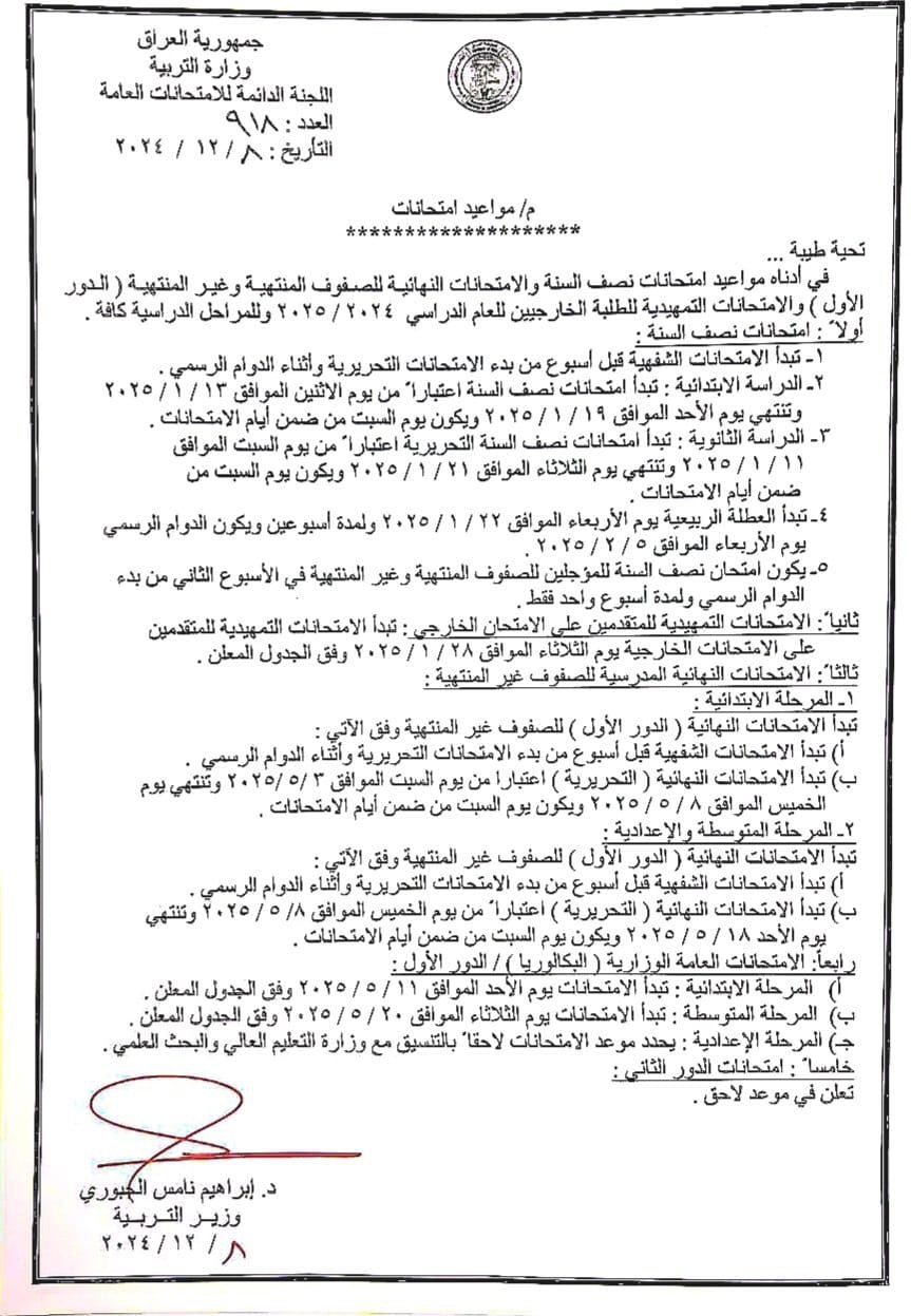 وحدد الوزير، يوم 13 من شهر كانون الثاني من العام 2025 ولغاية يوم 21 من الشهر نفسه موعدا لاجراء الامتحانات للدراستين الابتدائية والثانوية.