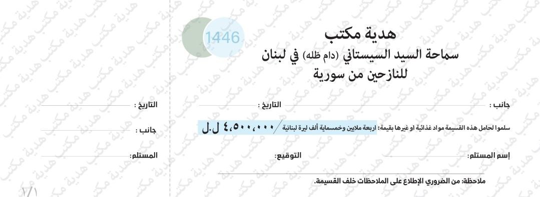 بدأ مكتب المرجع الديني الأعلى السيد علي الحسيني السيستاني في لبنان، حملة لتوزيع قسائم غذائية على العوائل السورية النازحة إلى الأراضي اللبنانية جراء الأحداث الأخيرة.