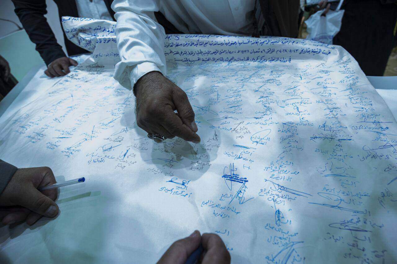 وتضمن المؤتمر التوقيع على وثيقة بين العشائر العراقية تؤكّد فيها الالتزام بتوصيات المرجعية الدينية العليا الداعية إلى تشذيب وتهذيب الأعراف العشائرية.