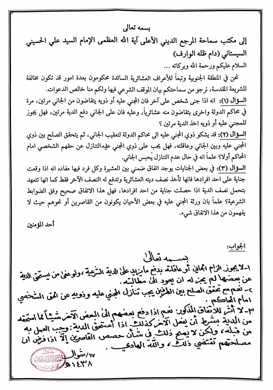 وفي استفتاء وجّهه أحد (المؤمنين) من المنطقة الجنوبية بتاريخ (شوال 1438 للهجرة) طلب فيه من المرجعية الدينية العليا بيان الموقف الشرعي من بعض الأعراف العشائرية وما إذا كانت مخالفة للشريعة الإسلامية.