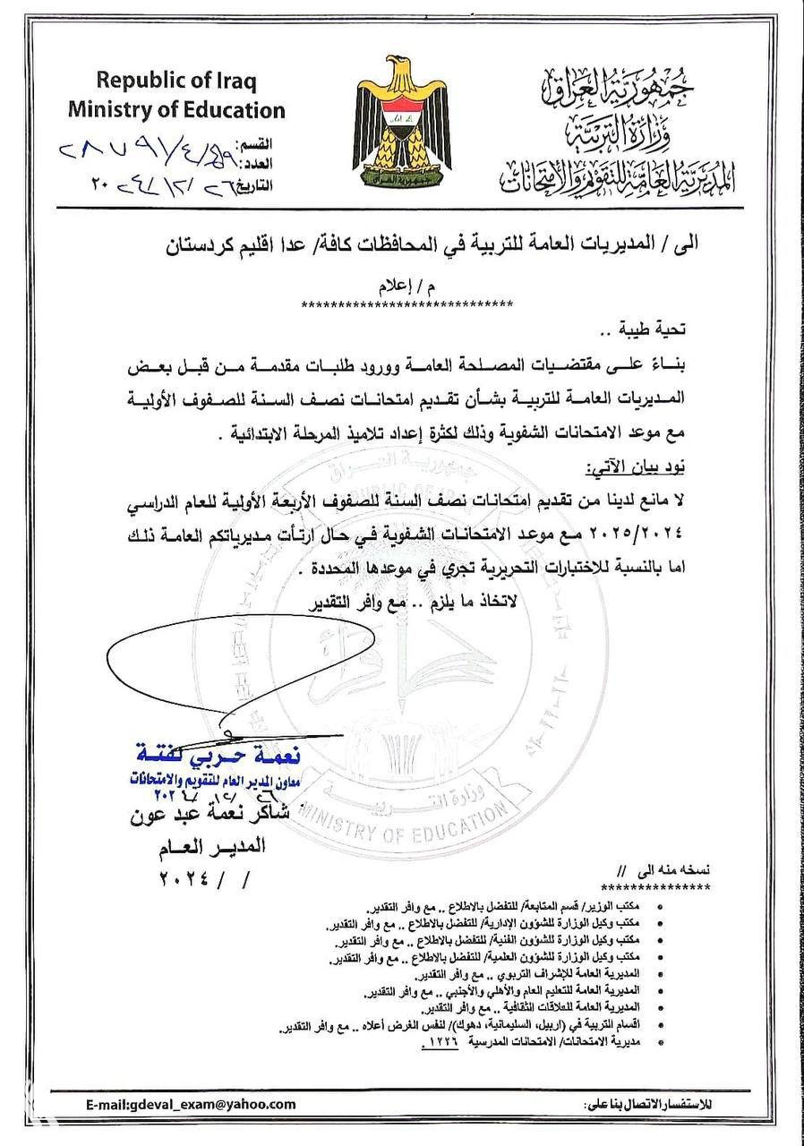 وذكرت الوزارة بحسب وثيقة تلقاها "كلمة الإخباري"، أن "المديرية العامة للتقويم والامتحانات، قررت تقديم امتحانات نصف السنة للصفوف الأربعة الأولية للعام الدراسي 2025/2024 مع موعد الامتحانات الشفوية وحسب رؤية المديريات العامة".