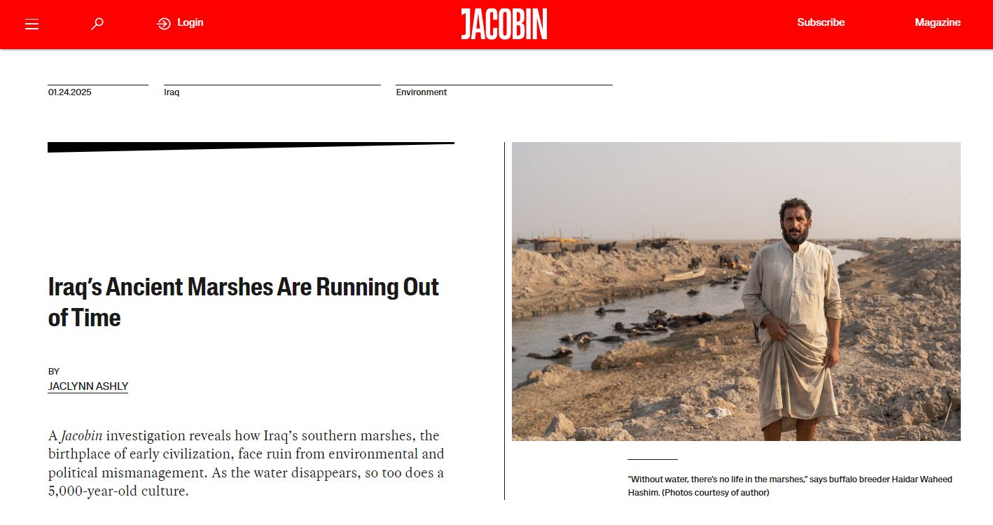 حذّر تحقيق صحفي أجرته مجلة (Jacobin) الأمريكية من تعرض الأهوار العراقية للنفاد والدمار بسبب ما وصفتها بسوء الإدارة البيئية وعدم وجود الموارد المائية البديلة لتغذيتها، مبينة بأن ثقافة عمرها (5 آلاف عام) على وشك الاندثار.