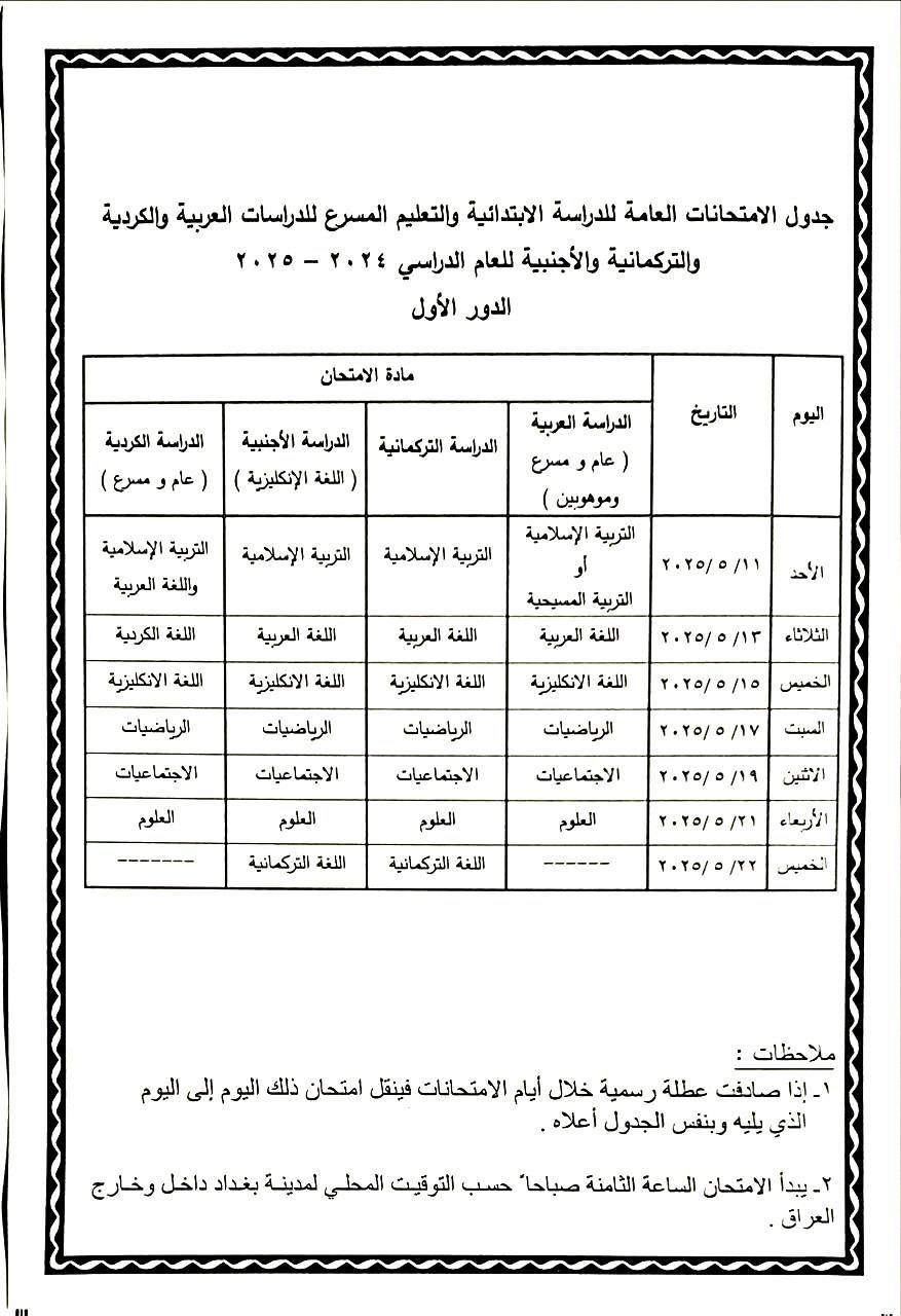 وينشر كلمة الإخباري الجدول الامتحاني الذي أعلنته الوزارة، والذي يبدأ لمرحلة السادس الابتدائي بتاريخ (11 – 5 – 2025) وينتهي بتاريخ (22 – 5 – 2025).