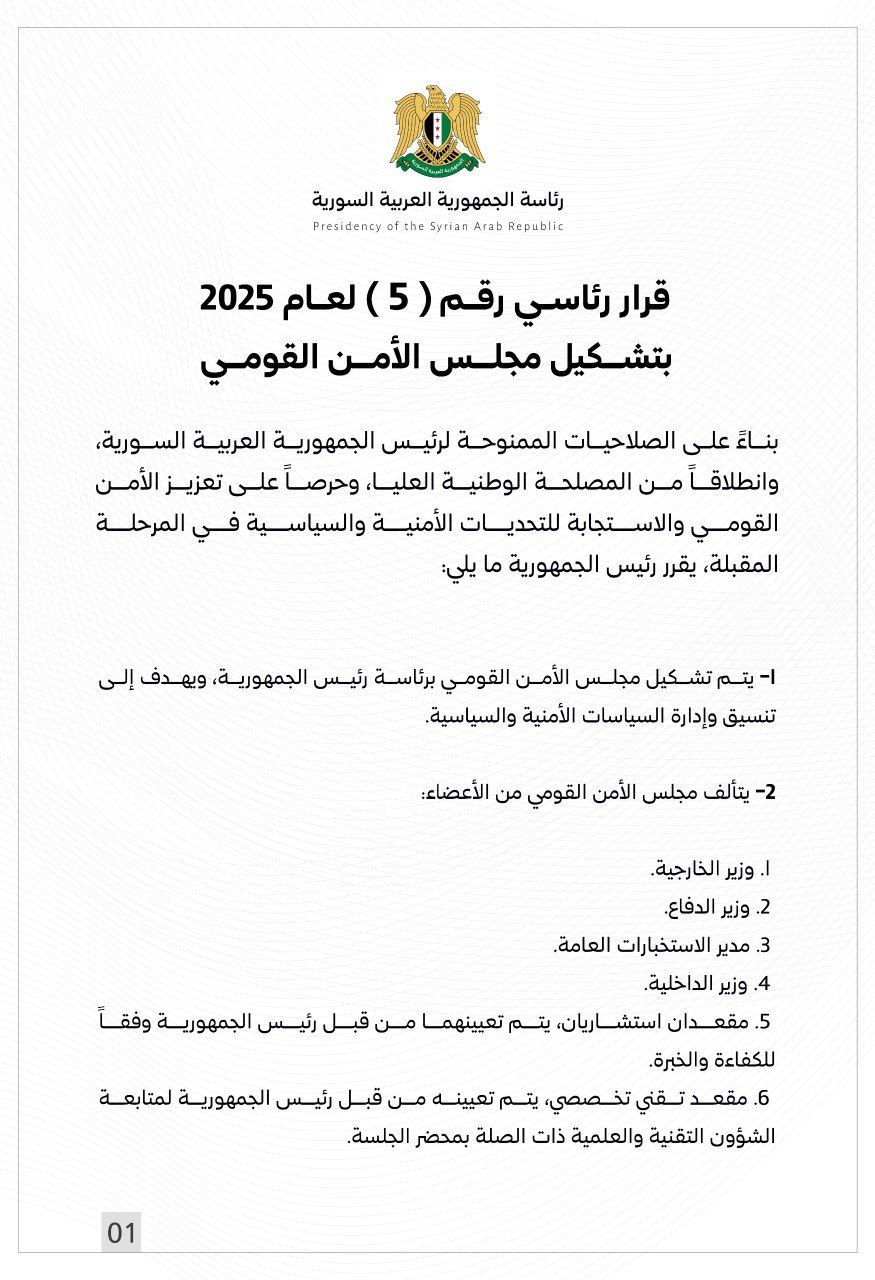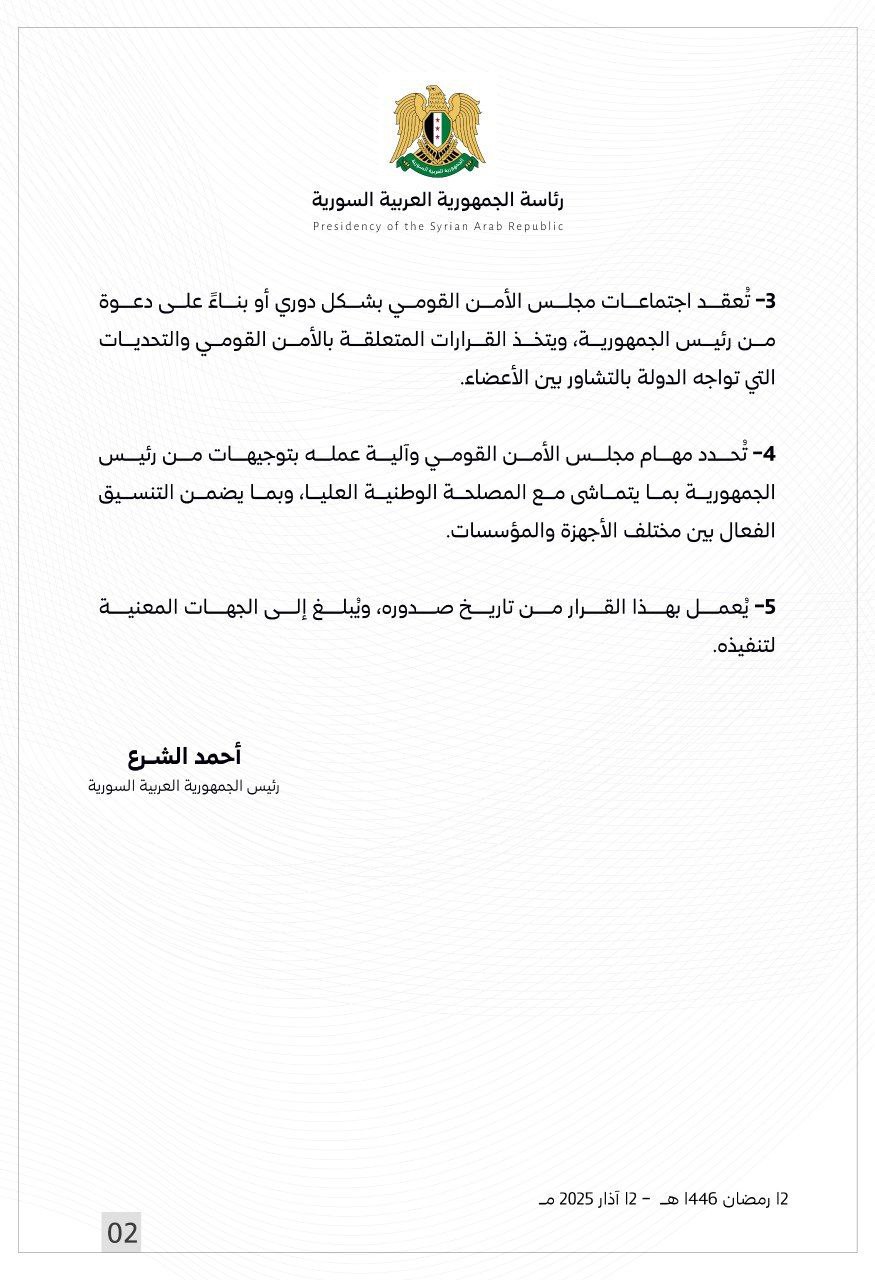 وجاء في كتاب رسمي صادر عن الشرع تابعه كلمة الإخباري، أنه "بناءً على الصلاحيات الممنوحة لرئيس الجمهورية العربية السورية، وانطلاقاً من المصلحة الوطنية العليا، وحرصاً على تعزيز الأمن القومي والاستجابة للتحديات الأمنية والسياسية في المرحلة المقبلة، قرر رئيس الجمهورية تشكيل مجلس الأمن القومي برئاسته ويهدف إلى تنسيق وإدارة السياسات الأمنية والسياسية".