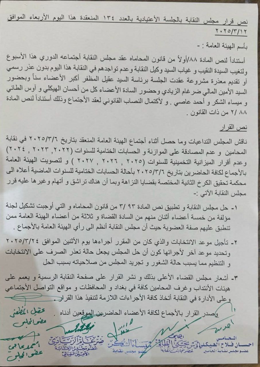 أعلن مجلس نقابة المحامين العراقيين، اليوم الخميس، حل نفسه بسبب ما حصل في جلسة الأسبوع الماضي من تراشق واتهامات وغيرها خلال المصادقة على الموازنة والحسابات الختامية للنقابة.