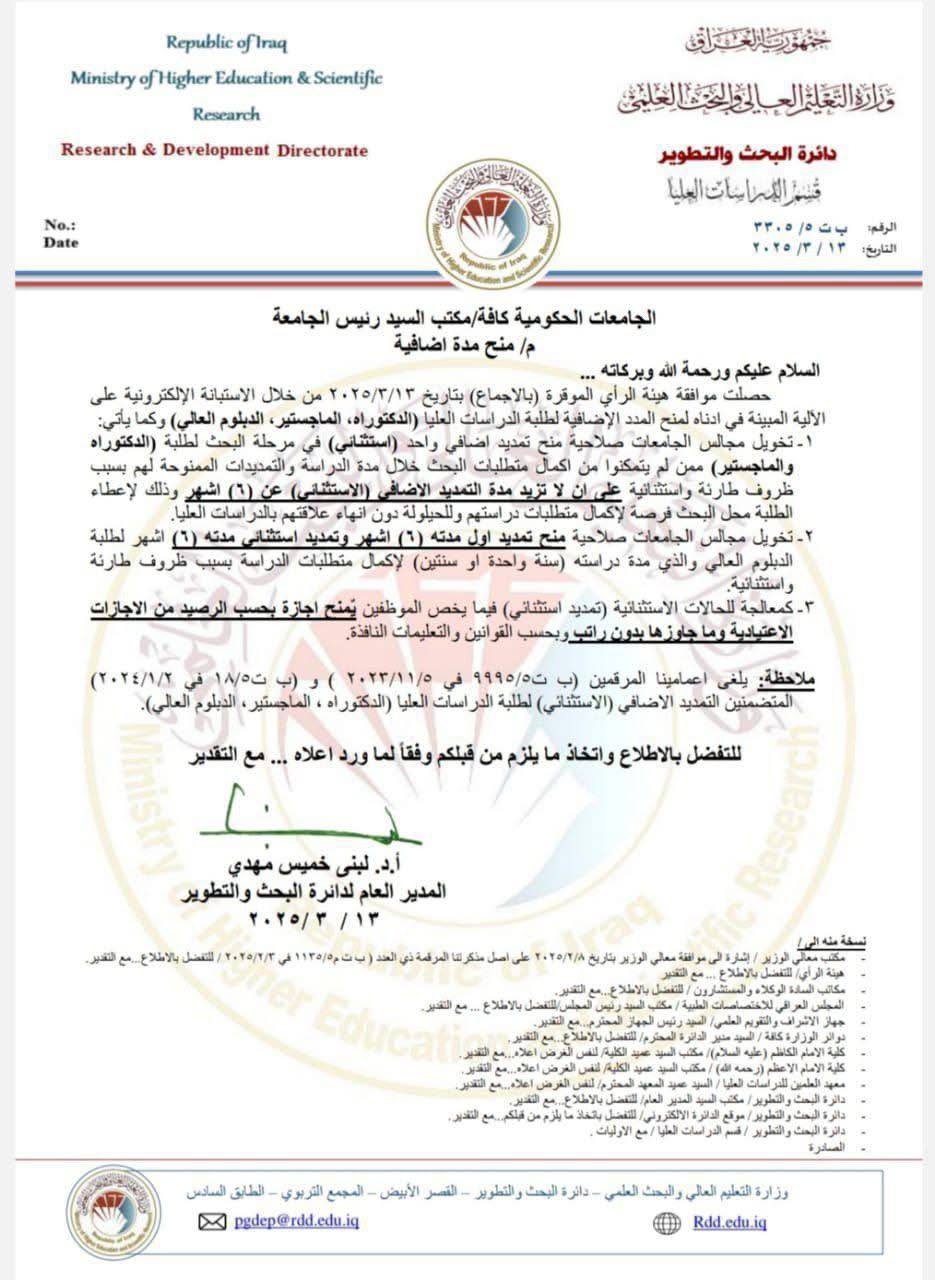 وبحسب الوثيقة فقد "تقرر منح المدد الإضافية لطلبة الدراسات العليا (الدكتوراه، الماجستير، الدبلوم العالي)، من خلال تخويل مجالس الجامعات صلاحية منح تمديد إضافي واحد (استثنائي) في مرحلة البحث لطلبة (الدكتوراه والماجستير) ممن لم يتمكنوا من إكمال متطلبات البحث خلال مدة الدراسة والتمديدات الممنوحة لهم؛ بسبب ظروف طارئة واستثنائية"، مبينةً بأن "لا تزيد مدة التمديد الإضافي (الاستثنائي عن (6 أشهر)".