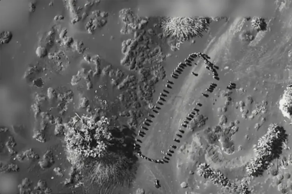 وتُظهر صور باللونين الأبيض والأسود، التقِطت من الجو، عشرات الأشخاص متجمعين في شكل شبه دائري قبل أن يتم قصفهم. ويلي ذلك تصاعد دخان كثيف، ثم لقطات للموقع الذي تعرض للقصف حيث لم يتبق شيء سوى بضع سيارات.