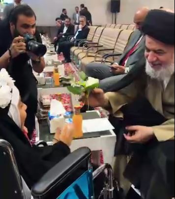 ورغم إعاقتها الجسدية وجلوسها على كرسيّ متحرّك، إلا أن ذلك لم يمنعها من التوجّه مباشرة للترحيب بالسيد الصافي وإهدائه وردة، تعبيراً عن امتنانها.