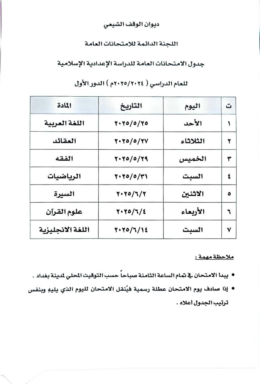 أعلنت اللجنة الدائمة للامتحانات العامة في دائرة التعليم الديني التابعة لديوان الوقف الشيعي، اليوم الثلاثاء جدول الامتحانات العامة للدراسة الإعدادية الإسلامية (الدور الأول) للعام الدراسي 2024-2025، والذي سيبدأ يوم الأحد 25 أيار/مايو 2025 ويستمر حتى يوم السبت الموافق 14 حزيران/يونيو 2025.