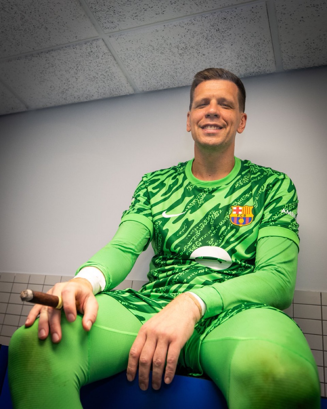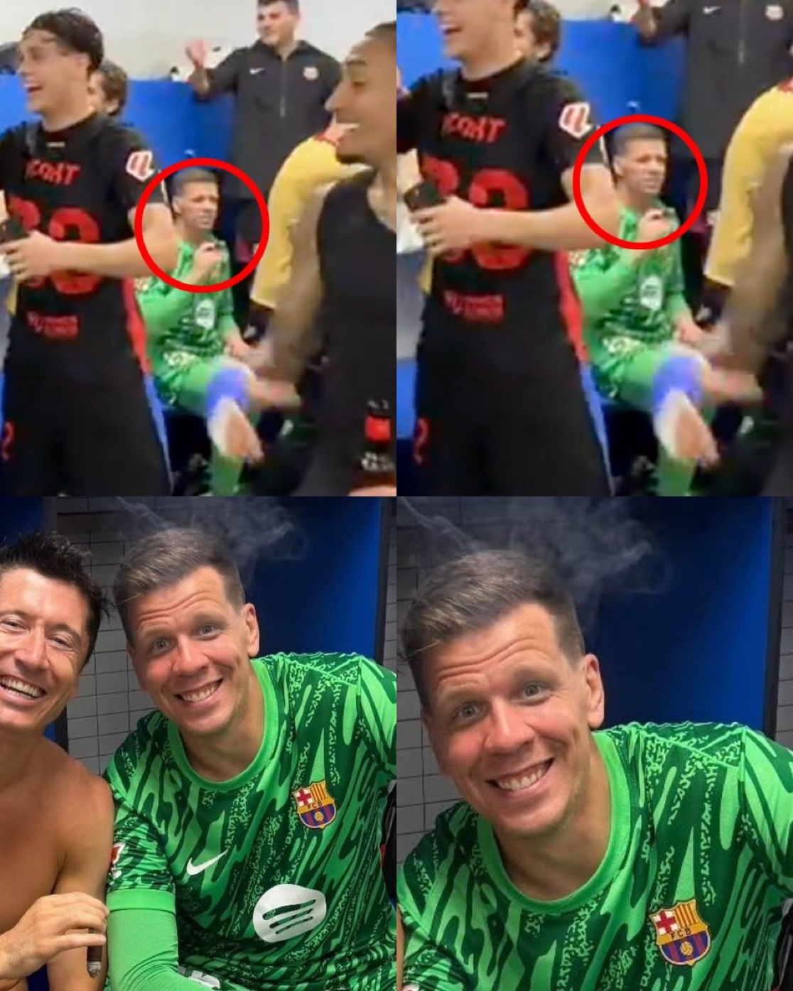 وظهر الحارس البولندي، وهو يدخن السيجار داخل غرف ملابس برشلونة بعد نهاية المباراة التي جمعت الفريق الكتالوني بإسبانيول.