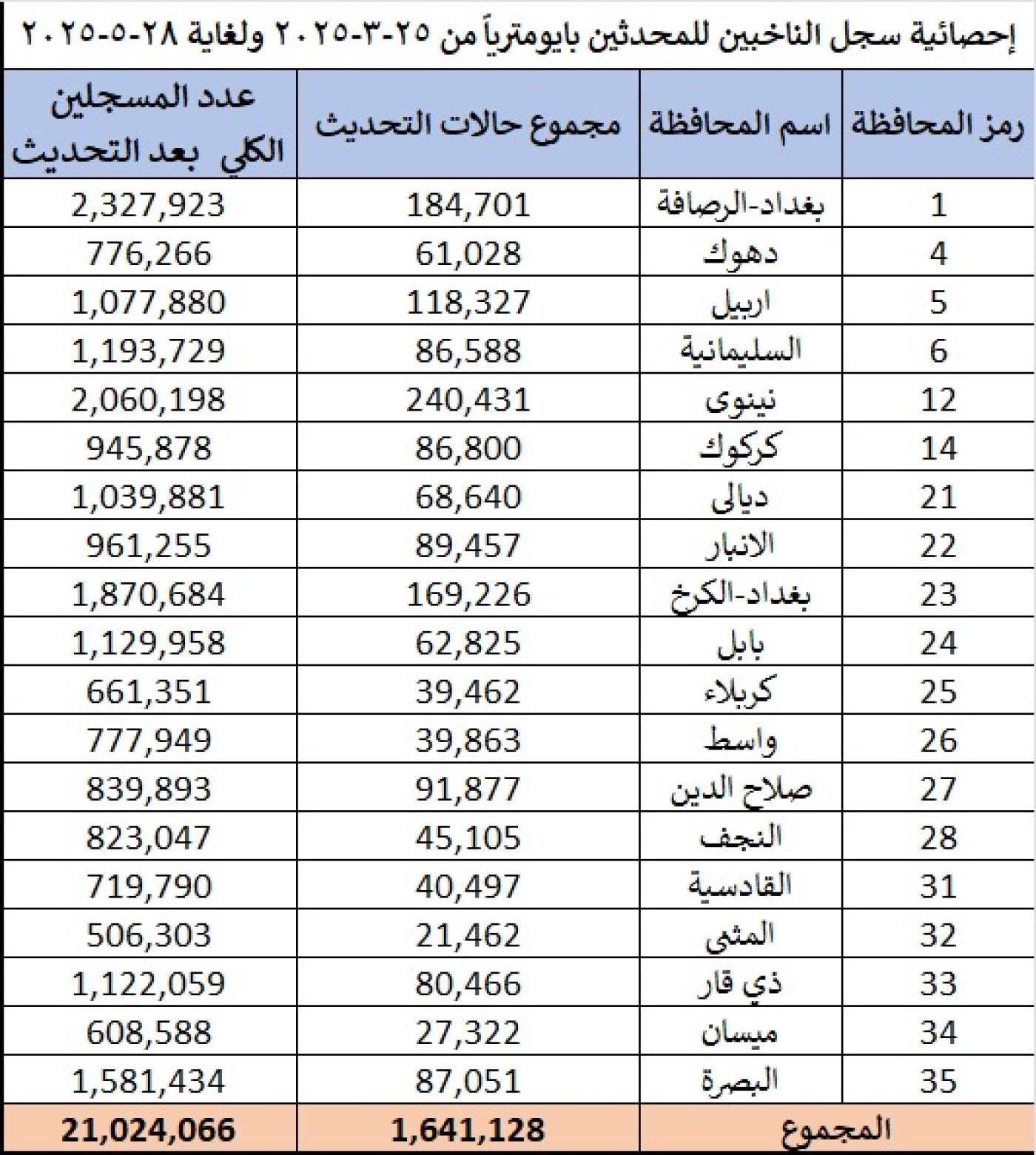 وأضافت المفوضية بحسب الإحصائية، بلغ العدد الكلي للعراقيين المحدثين للبيانات بايومترياً حتى الآن 21 مليون و24 ألف و66 شخصاً، من اصل نحو 30 مليوناً يحق لهم التصويت".