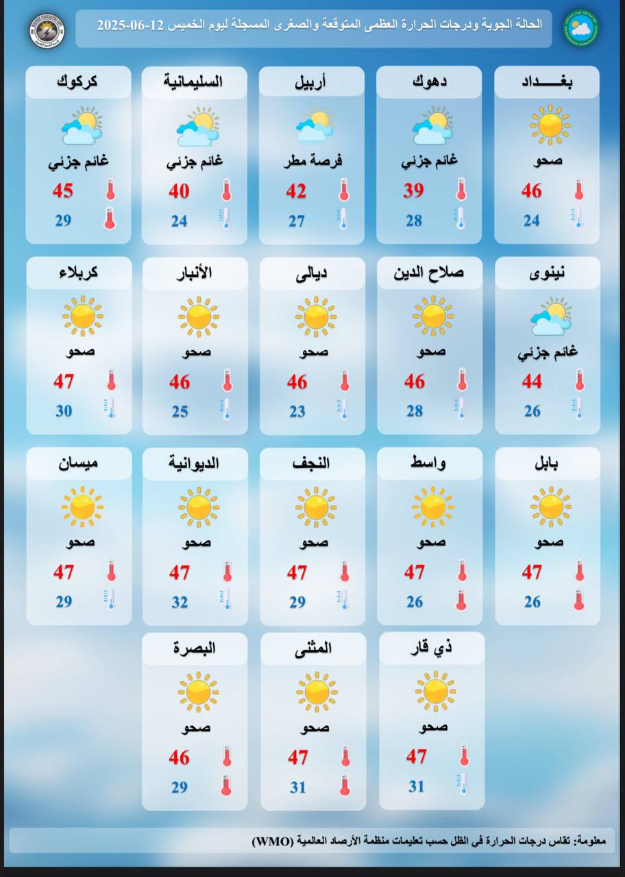 وسجلت العاصمة بغداد درجة حرارة صغرى بلغت 24 وعظمى 46 درجة، فيما سجلت كربلاء، وسط البلاد، 30 درجة صغرى و 47 درجة عظمى