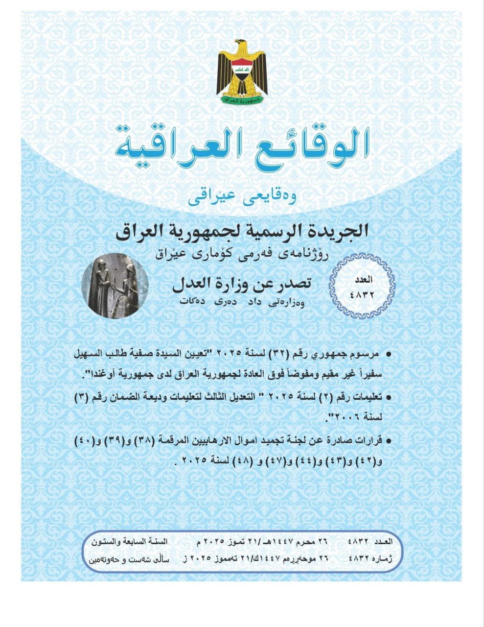 وقالت مديرة عام دائرة الوقائع هيفاء شكر محمود في بيان تلقاه كلمة الإخباري إن “العدد 4832 تضمن صدور مرسوم جمهوري رقم 32 لسنة 2025 المتضمن تعيين السيدة صفية طالب السهيل سفيراً غير مقيم ومفوضاً فوق العادة لجمهورية العراق لدى جمهورية أوغندا”.
