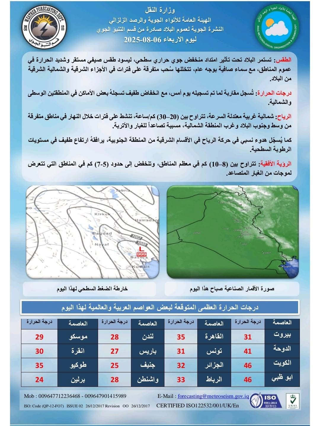 وسجلت العاصمة بغداد درجة حرارة صغرى بلغت 30 وعظمى 46 درجة، فيما سجلت البصرة، جنوب البلاد، 32 درجة صغرى و 50 درجة عظمى.