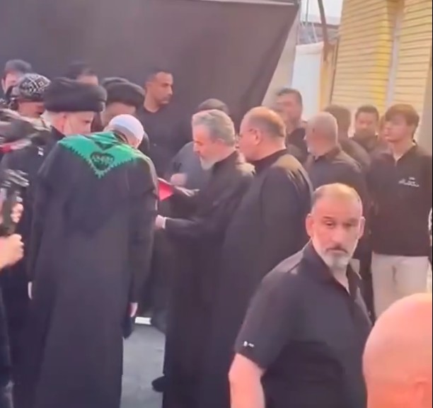وأظهر المقطع المصور الذي حصل عليه كلمة الإخباري، مقتدى الصدر وهو يستقبل فيه بيته بمنطقة الحنانة في محافظة النجف، كلاً من الكربلائي والمحنه، في تقليد يتصل بإحياء عزاء الإمام الحسين (ع).