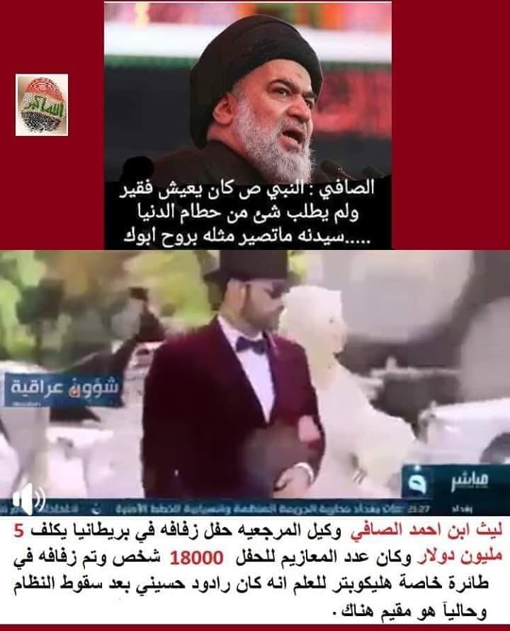 ٣. الشاب الرادود الذي انتشرت صور بأنه أقام حفل زفاف بخمسة ملايين دولار إسمه ليث البلاغي من ابناء الجالية.. ولا نعرف حقيقة الزفاف المزعوم.. ومن يريد أن يتحمل وزره فهو وربه.